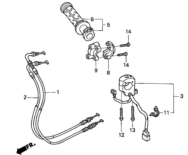 Undo the two screws, 12 and 13, disconnect the wires from the front brake switch and the wiring connector from the headlight nacelle and the switch assembly will come away. The throttle cables stay with the twist grip, the weight stays on the handlebar etc.