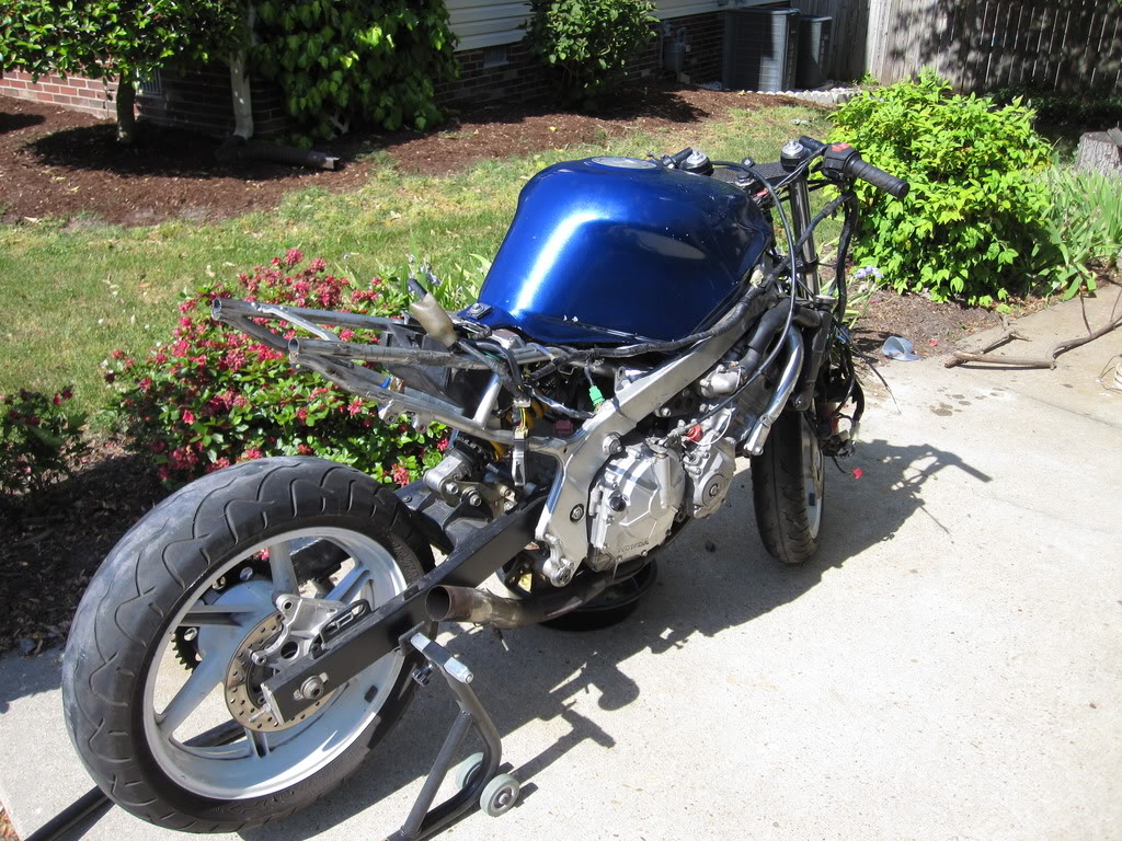 this is my second "build" but my first real one. you can see my first one here: http://www.customfighters.com/forums...ad.php?t=32811 I am starting with a 93 cbr600 f2 in kind of pitiful condition. Picked it up for $660. here is what it looked like when i got it: Attachment 55834 Attachment 55835 Attachment 55836 I have a bunch of stock parts and a few aftermarket ones to sell too, so PM me if you are interested in something. (i dont have enough posts yet to put them in the for sale area) Attachment 55837 Right now things are moving kinda slow because i am trying to finish up another project that has a deadline before i really get started on this one. I have however, labeled and removed the wire harness: Attachment 55838 Removed all the hardware: http://i23.photobucket.com/albums/b3...7/NewSV511.jpg bought some new parts: Attachment 55839 and gotten the bike ready to pull the carbs. and drop the engine: Attachment 55840 I have a GSXR 750 seat in the mail now, as well as an integrated tail-light. I am going for something like this (minus that bellypan): steel and carbon fiber subframe and bodywork. hopefully i can hide some of the wiring (and a smaller battery) in there. Attachment 55841 more to come thanks ~Chris |