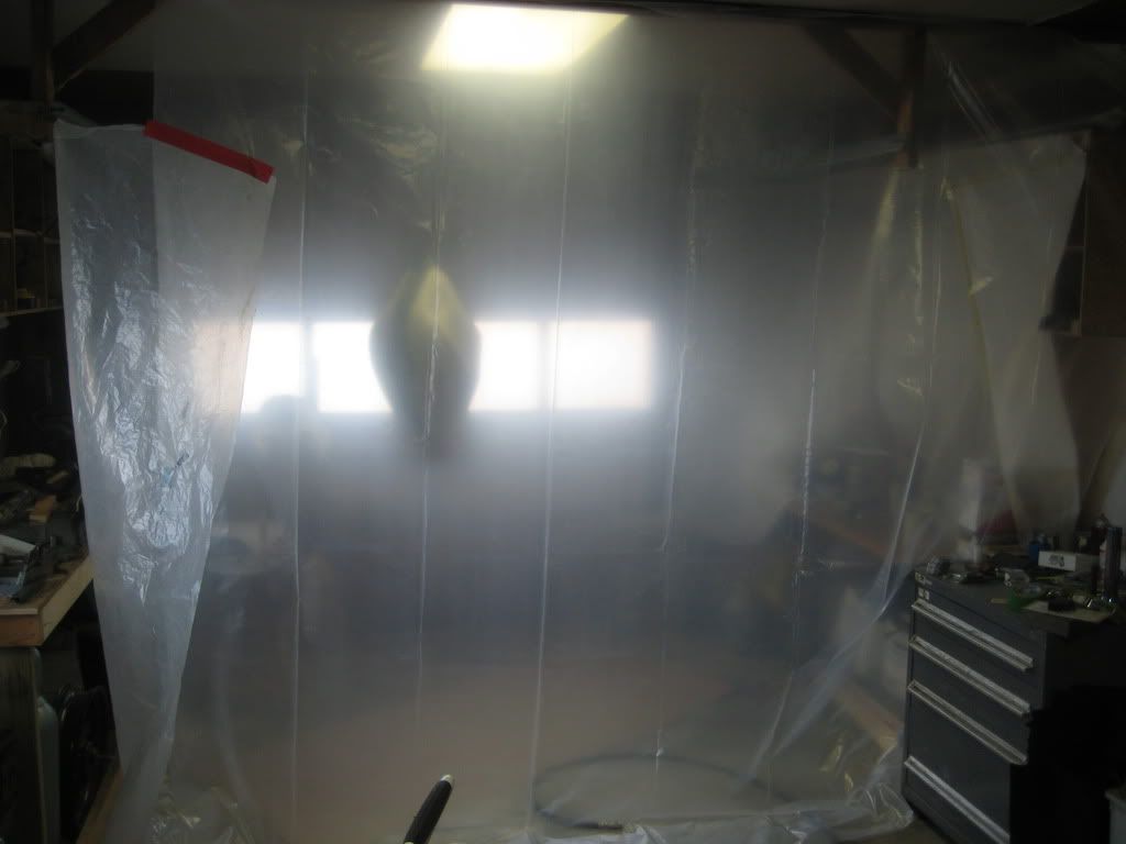 The paint room got filled, but i already have everything masked up, so instead of ripping all that off and waiting till wed to paint, i got some poly sheeting and rigged up my garage. I borrowed a air compressor from a local SVer (THANKS BEN!) and put a heater out in the garage to get it up to about 70.