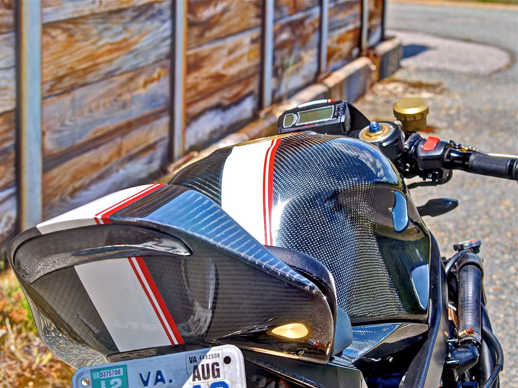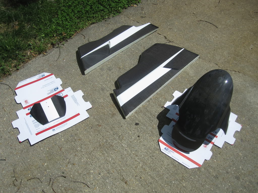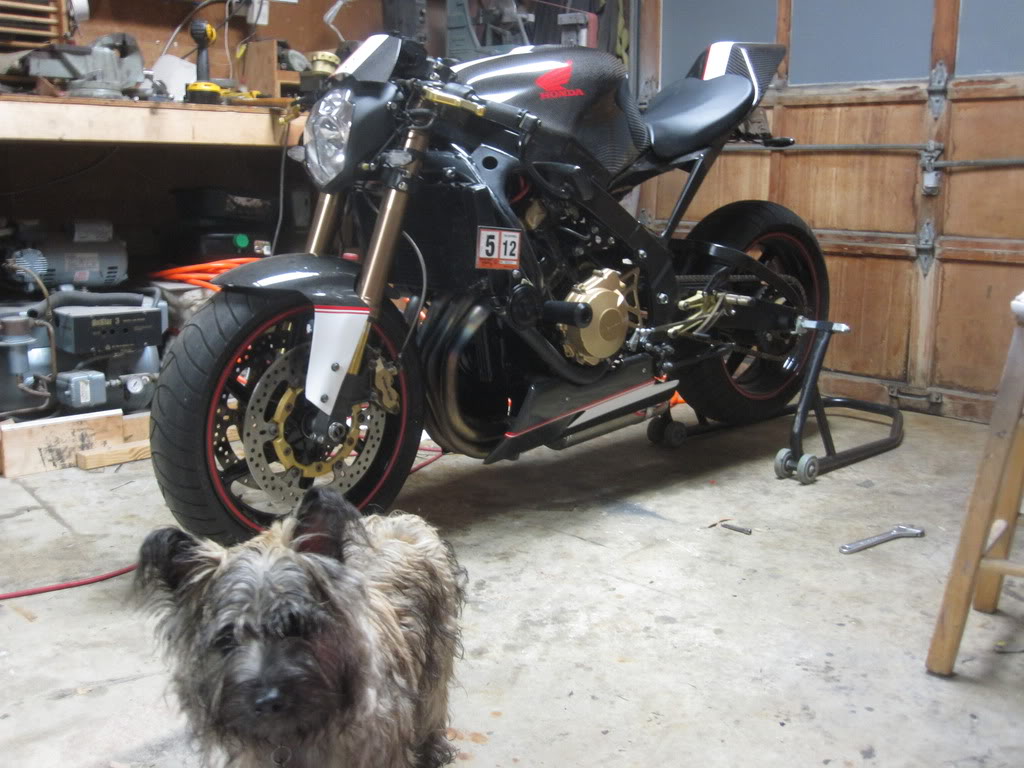 Attachment 39179 Also.. i am a real pro at disassembling this thing now. i can take it from fully assembled to body off, and carbs out in 8.7 minutes. I also finished painting the new parts... (and repainted a few old ones) Attachment 39180 mechanical work was finished on saturday and then it took me a couple hours on sunday to make new brackets for, and mount the new lowers. Attachment 39181 Attachment 39182 then i took them off and buffed the paint and put the stripe on them, but i didnt want to pull it back out in the dark. more pictures of it soon. my dog was checking it out.. but found the trash on the floor more interesting. We had a talk about that. Attachment 39183 thanks for looking! more soon. ~Chris |