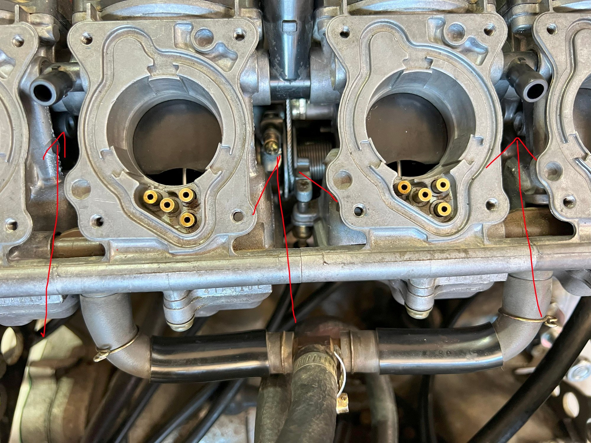 As to the position of the screws in question, a good starting point is to have them set so you can barely slide something small between the butterfly valves and the carb throat. People use all sorts of things. Some use a guitar string or a small gauge. I personally always use a small sewing needle, because that’s what I had handy once and I just stuck with it.