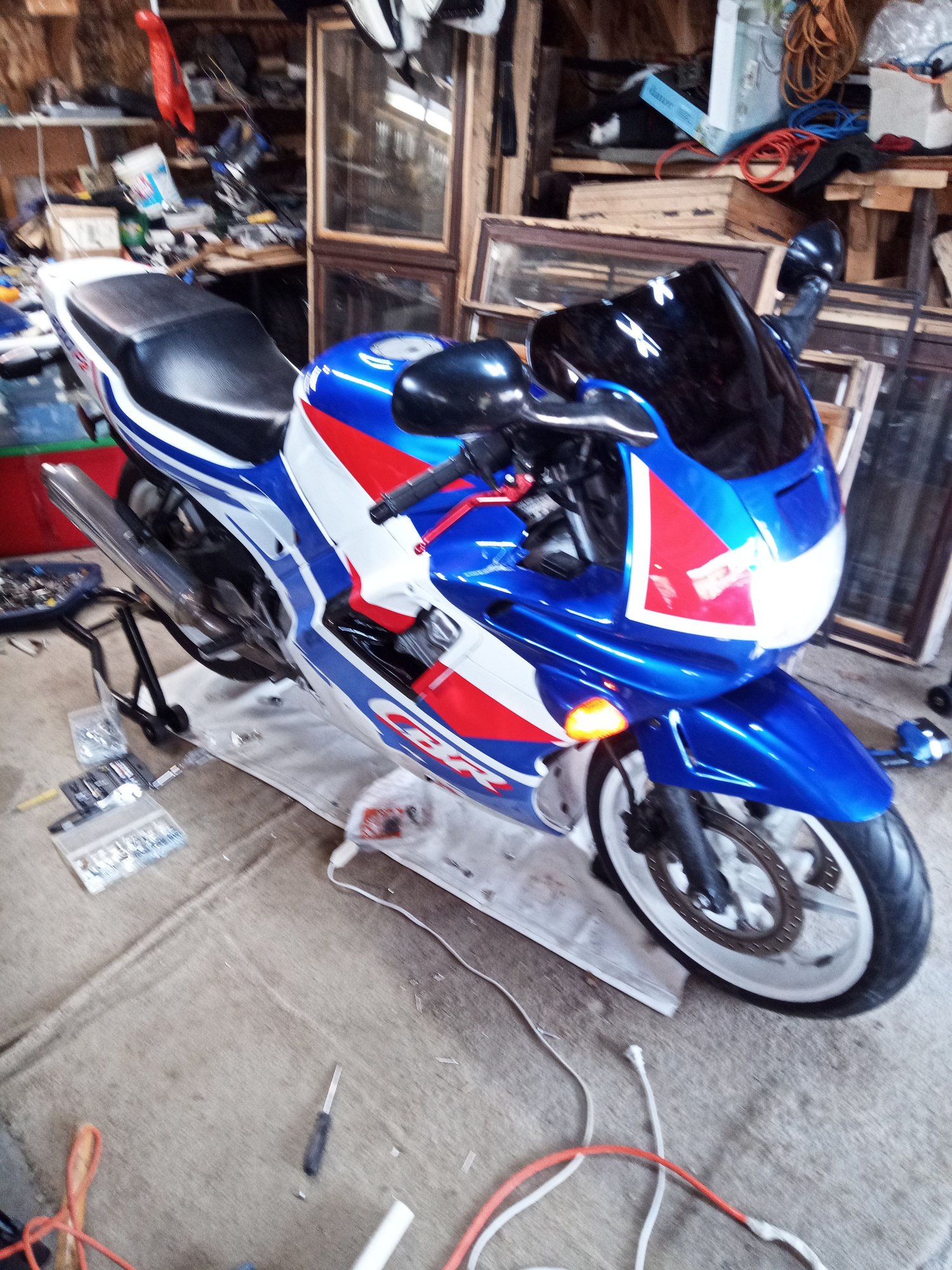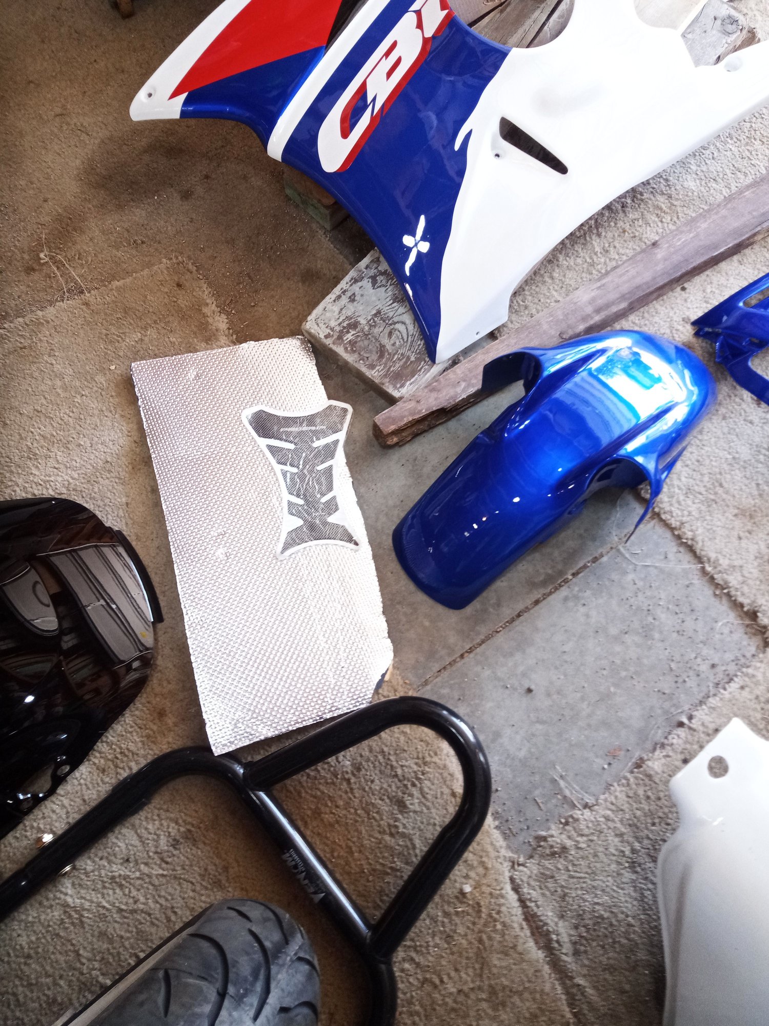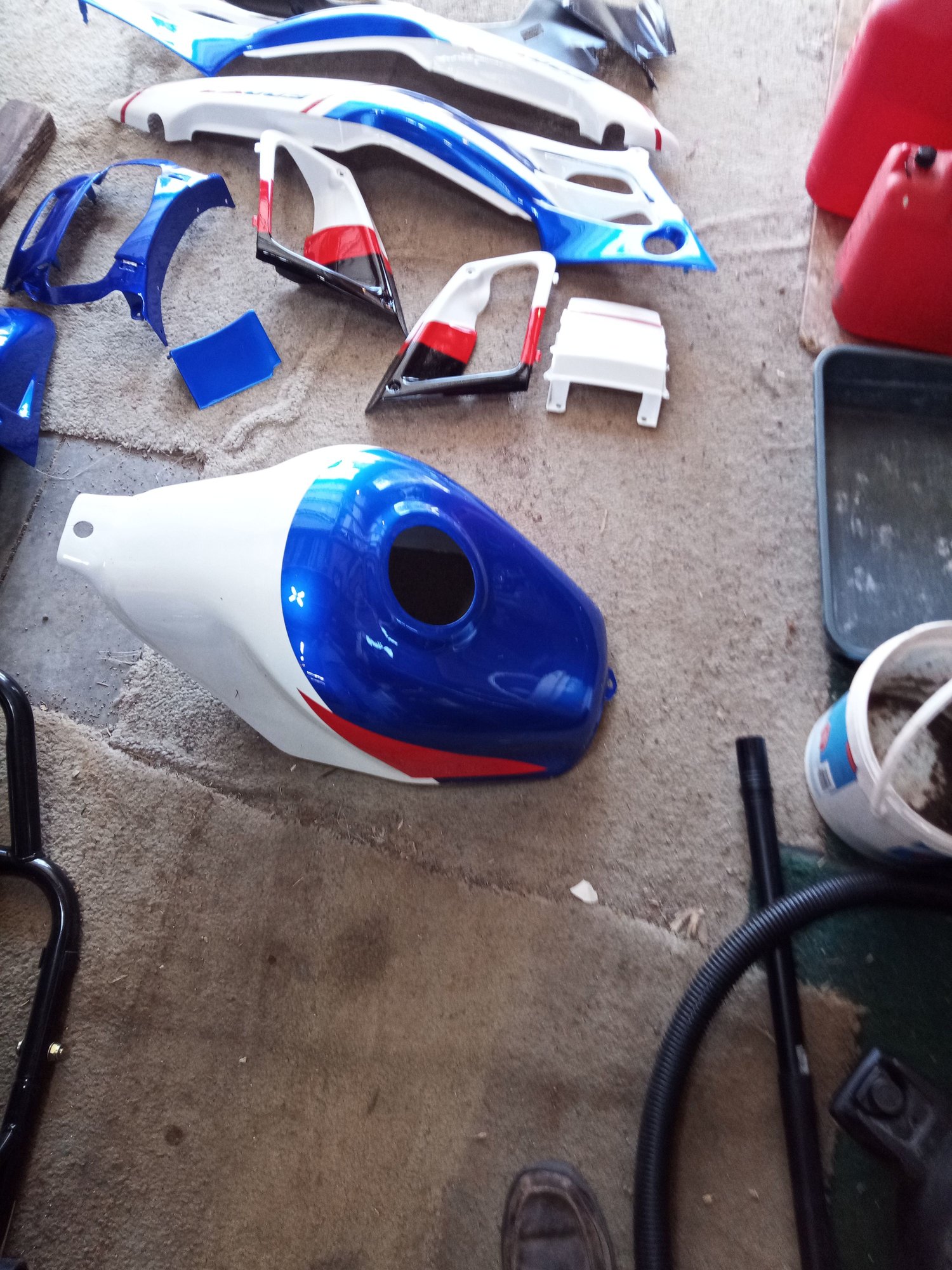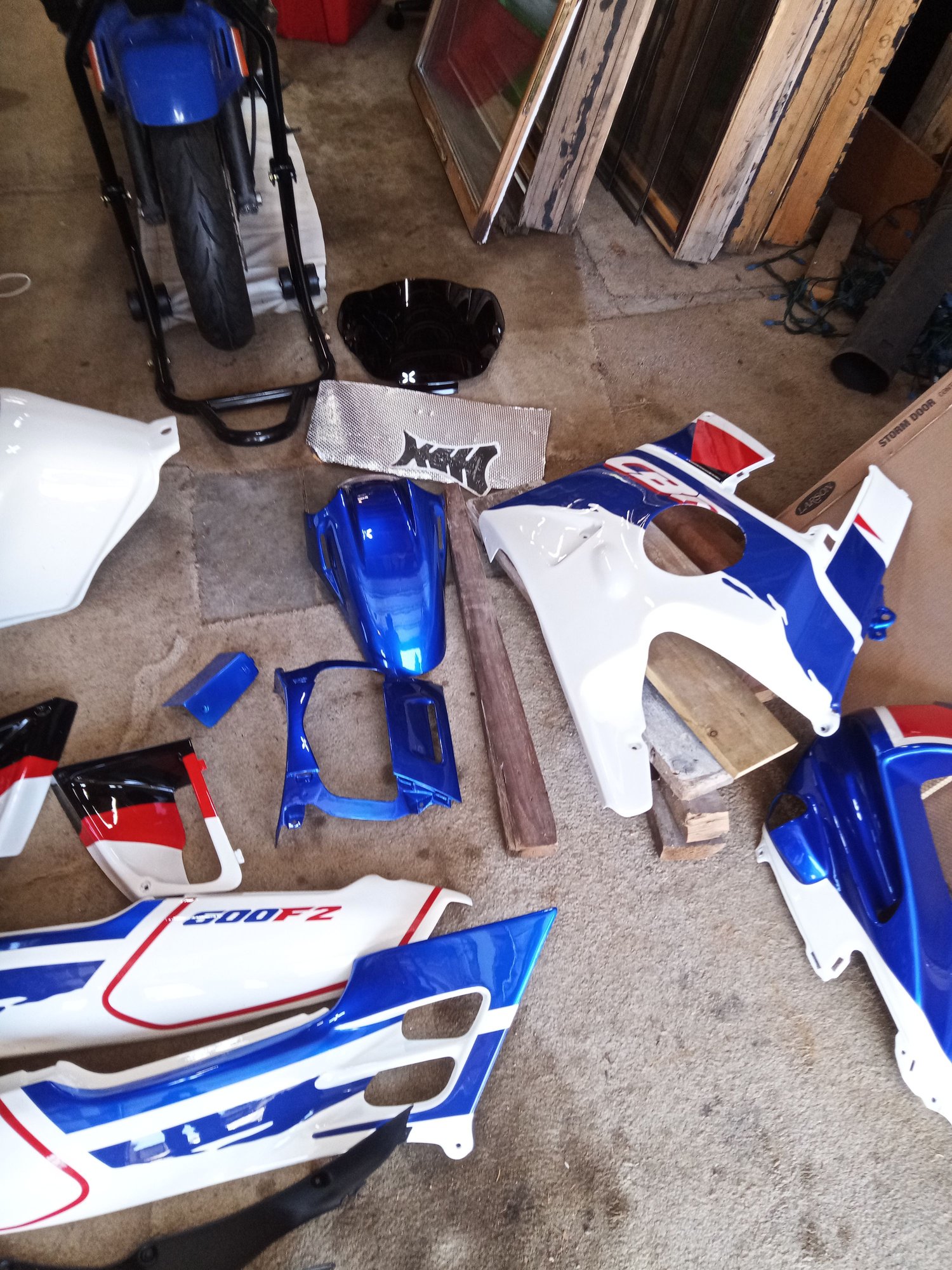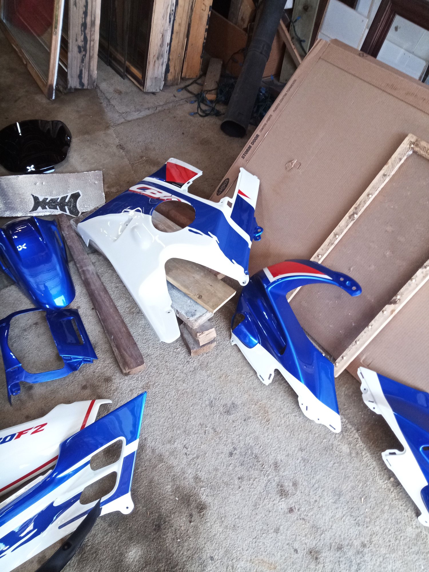 I hsd exactly the same problem with my 93 f2,on the left upper near the indicator it was covered in white duck tape, underneath was a large hole,i used wire mesh took my time to mold it in the right shape,fixed it to the back of the panel with Gorilla Epoxy, then filler and sanded down on the outside, by the way my bikes main colour is white, it is Ross White,and you can buy large aerosol cans on ebay, i also used Gorilla Epoxy for the cracks,