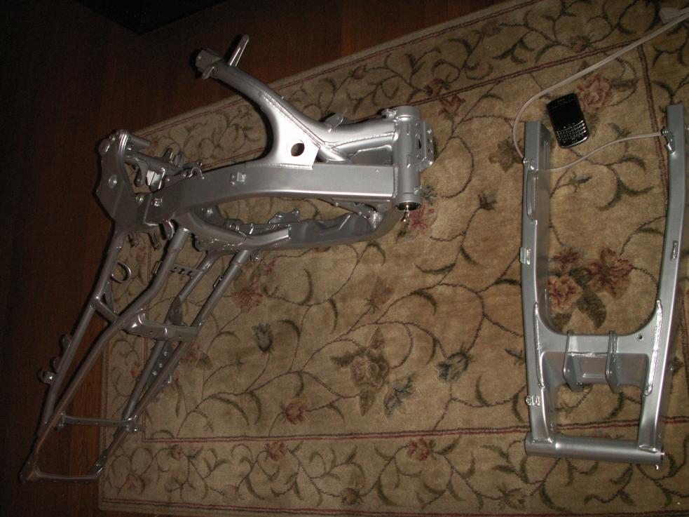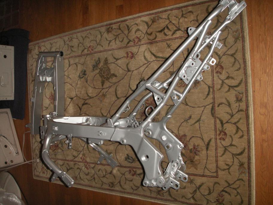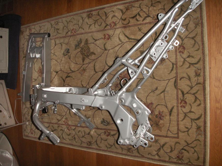 So I was having issues with rust on my F3 frame and so I took it upon myself to get it removed and then repaint the frame. I just got the frame back and ooooooohhhhhh boy is she looking good. It's kinda funny, my entire motorcycle is inside the house. Thus far, I've rebuilt the rear shock and revalved the forks. Here are a few shots.