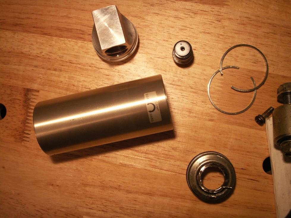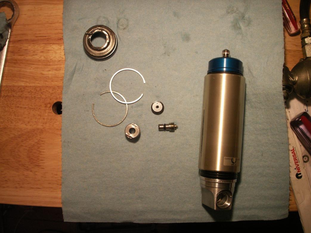 The rear shock has been completely refurbished with Race Tech replacement parts. This includes all seals, o-rings, oil bladder, shims, bushing, valve, and shrader valve. Prior to doing this, the shock had never been serviced. I was surprised to find that the shock was not leaking any oil. However, the nitrogen had probably leaked out long ago. When I drilled a hole in the end cap, no gas was released.