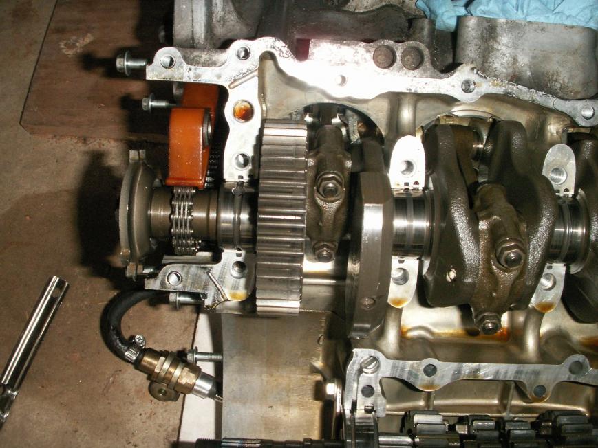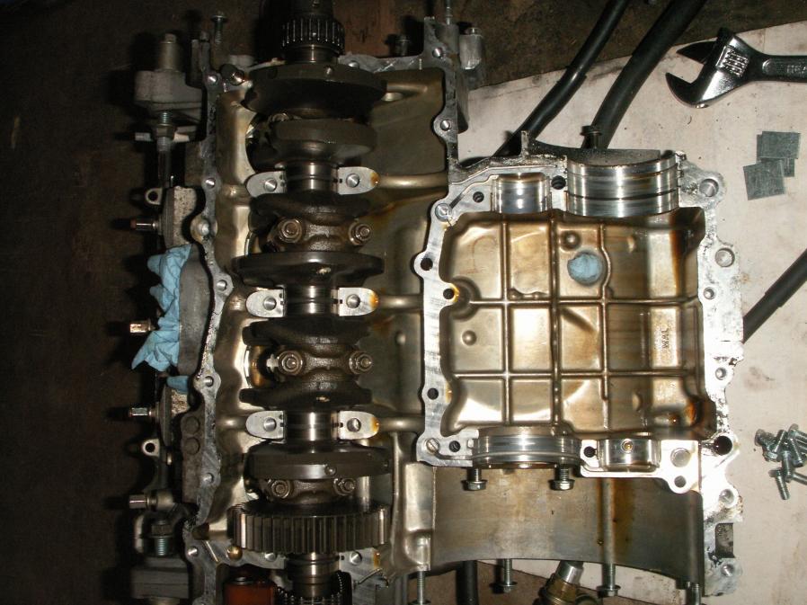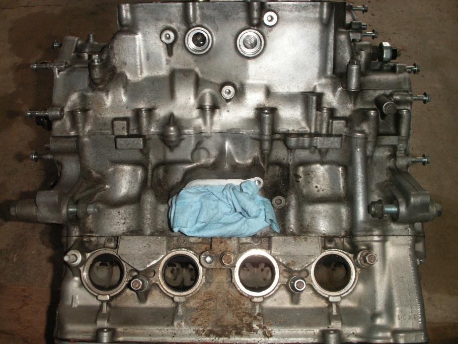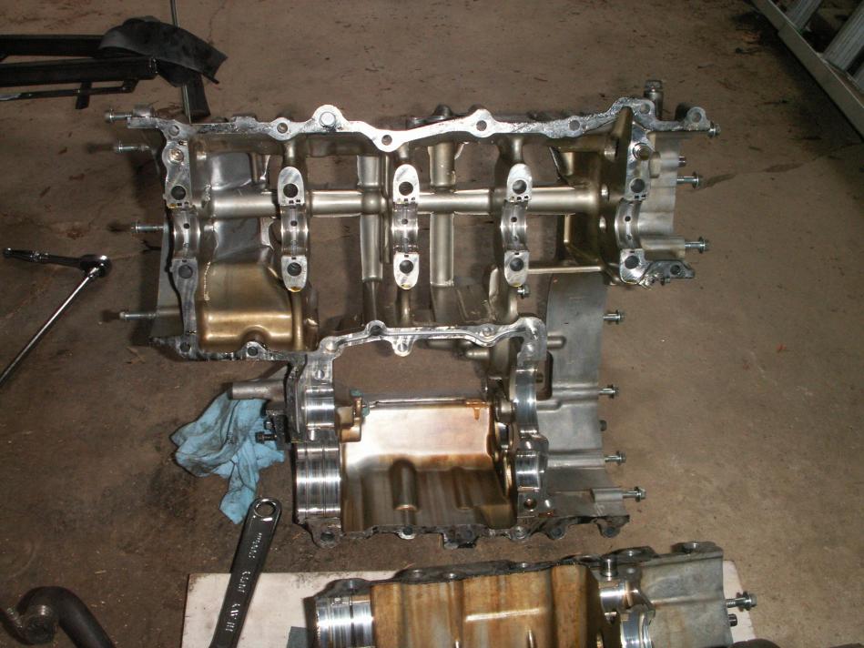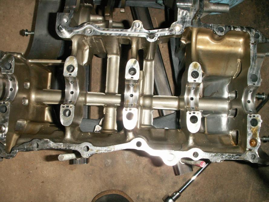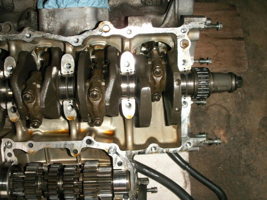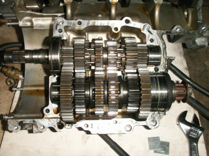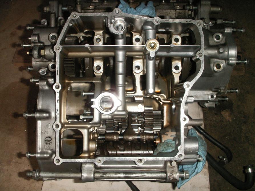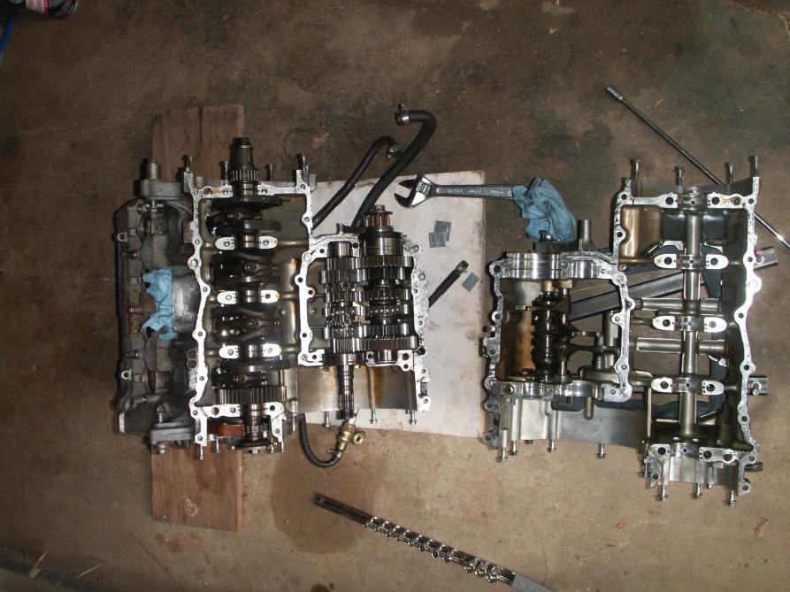 Sorry for the delay, I've been busy with 60 to 70 hours work weeks. So I split my cases and got a look at the tranny. Looking like I need to replace a couple gears that have damaged dogs on them. My forks still look good, but I still need to take some measurements. Here are a few shots for people wondering how an engine is split open. I've removed the clutch everything with exception of the head since I don't plan on moving the crank at all. I gave different vantage point to show what has been removed. I didn't show the top of the engine, but I have removed the bolts from the top of the tranny.
