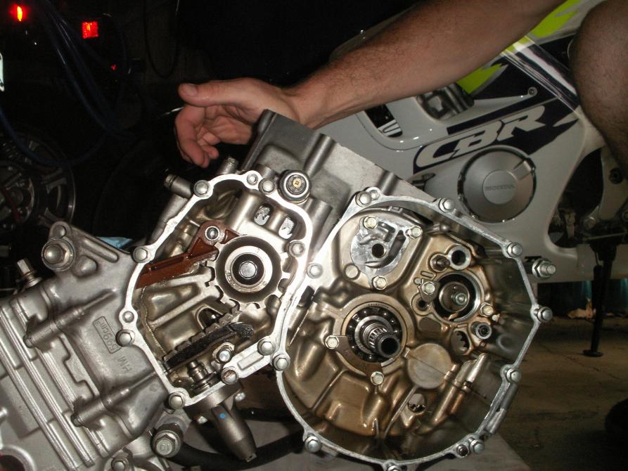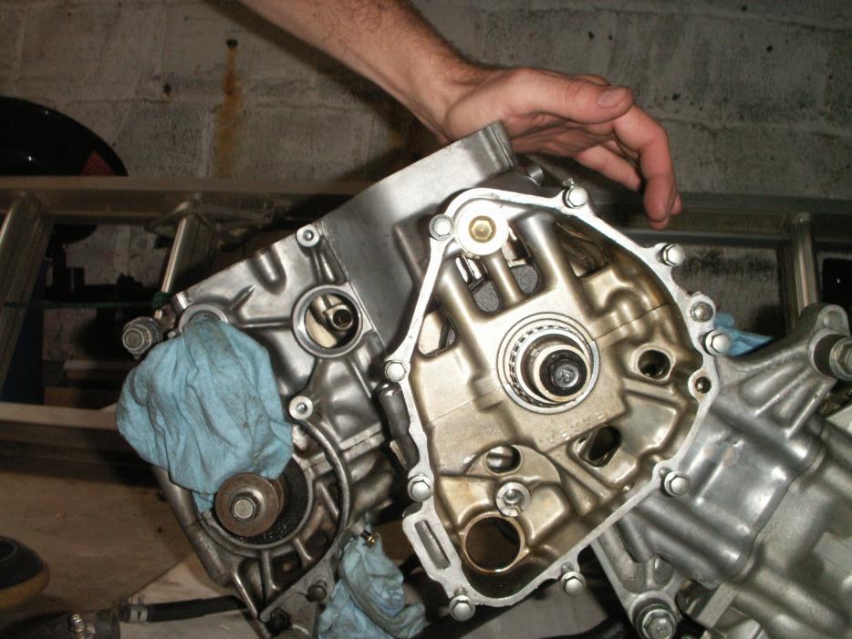 Splitting of the engine took only seconds because of the splitter I built. It took longer to bolt the thing up than it did to split the cases. It ensures there is no damage to the mating surfaces because they're pulled apart instead of sticking something between them (which can EASILY cause damage). After the cases are separated, the tranny just pulls out for the most part. The main shaft (closes to the crank) is held in by a plate with two fasteners which are easy to loosen. The counter shaft just pulls out. Watch out for the bearing caps, they like to fall off. If you look closely, you can see why the cases need to be split to replace the counter shaft seal. There is a tiny groove that it keys into.