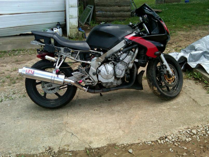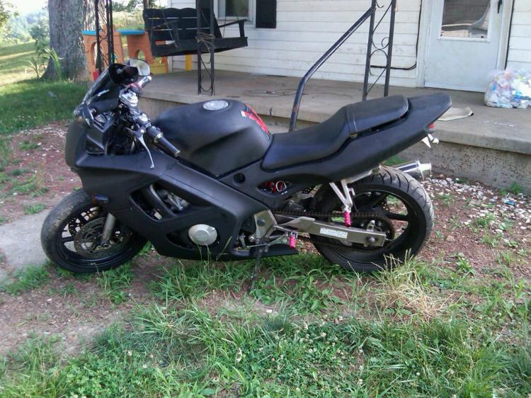 the first is when i first got her,the second was the process tear down and rebuild,and the last three is what it looks like now.im very happen with the out come.and come tax time this up coming year im getting new red flamed fairings,right now it has,,yoshi slip on,db windshield,carbon levers and mirrors,stage 1 jetted carbs cleaned and syncd,red driver and pass footpegs,red/carbon grips with matchin tank pad,new vortex clip-ons,carbon flush mount front signals chrome alien turn signals in back,eliminator kit,led tail/brake light,6 led strips through the body and 1 in the gauges,k&n air filter,and new brakes,frame sliders