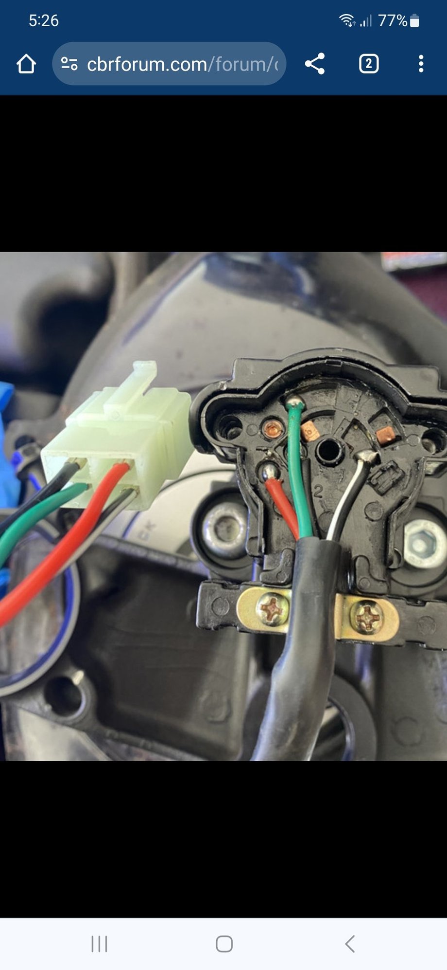 Here's ign-switch diagram for early CBR600RR that works with that aftermarket switch after swapping 2 terminals in connector.
