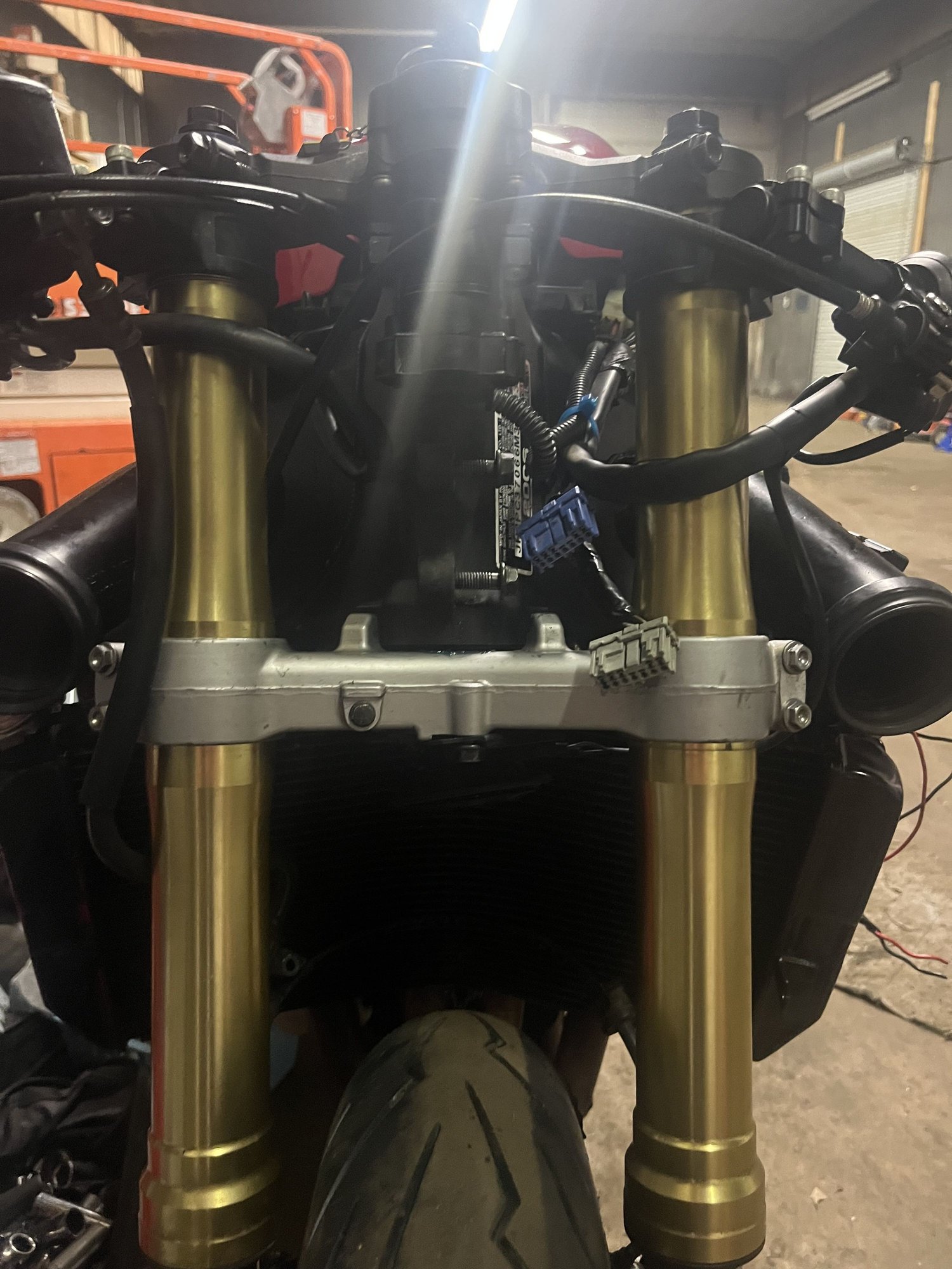 Hello so I'm working on this 2006 honda cbr 600rr for my buddy he bought it a few months ago and it's been problem after problem. I'm so lost with this problem. The wheelbase is off its roughly 53.5 inches and the front tire I feel is way too close to the exhaust causing the faring's in the front to hit tire. the stem bearings were bad, so I replaced those but still having the same problem. here are some pictures. any suggestions on why the this is happening is greatly appreciated