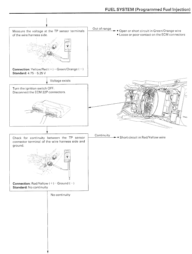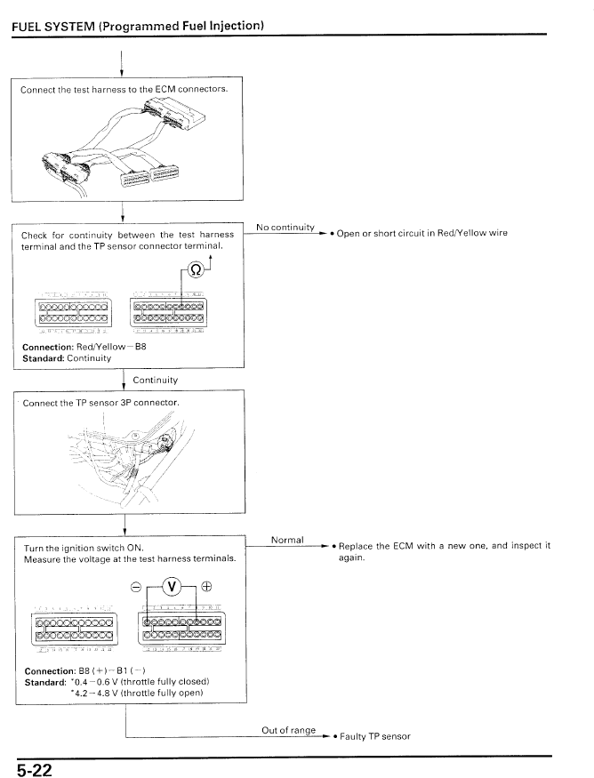 Use wiring-diagram and confirm colours of wires going into every sensor. ECT and TPS uses same connectors as some others in that area and can easily get plugged in to improper location during desperate parts swapping. Better to make list before starting. I’ll do 1st one: