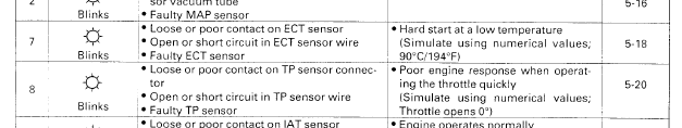 Error fault code 7 & 8 as already noted, are for TPS and ECT. Test and measure according to manual's procedures: Vcc reference voltage line, ground wire, output signal wire and output voltage signal itself.