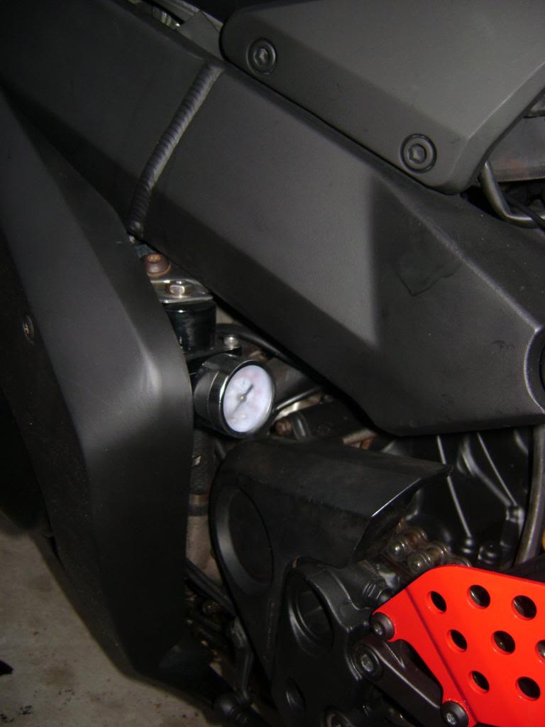 (7) finally, go ahead and button it up. stick the fairings back on and test it out. as previously mentioned the stud i used to mount the fpr is actually an adjustment screw. before starting, loosen the lock bolt and use the provided allen key to back the screw all the way out. this is the lowest pressure setting. then disconnect the vacuum line and clamp it or pinch it so you dont have a vacuum leak. start the bike up. it might barely run due to lack of fuel. if it doesnt start at all tighten the screw down till it does start. now screw the adjustment down till the guage reads the desired psi. i believe it is about 50 psi. don't be afraid to screw it in large increments at a time. it's not very sensitive. when you reach 50 psi shut the engine and reattach the vacuum line. finally don't forget to tighten the lock nut when you're done. here is a short video explaining how to adjust it.