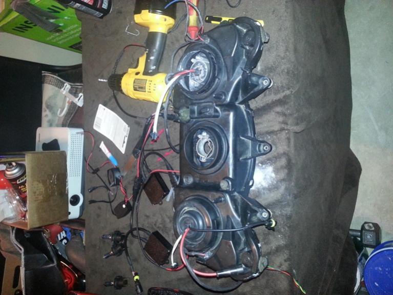they're here!!! well at first site i was confused as all hell why i got a usps box but was tracking my shipment through ups? l then i realized they just resused a box which was weird lol. But non the less when i open the box eveything was very well wrapped . all though i did not expect to get as much as I did! holy heck. If your not a tech savy person this kit is not a do it yourself type deal..... To start i paid 330$ for them. which is pretty steep and the directions looks like a 4 year old put them together. which is fine because I understand how everything works and half the wires are already ran from my last set up. second you will have to drill and take things apart and reassemble things in order to make things fit right and look great. i ahd to drill a hole to get the wires through and hidden to the back. as you can see theres tons of little recivers and regulator boxes for everything. the wirless remote that comes with it is actually really nice! the hardest part is making sure you dont over tighten anything. the projecotrs are put together pretty well but they do have some week points like the screws holding in the hid bulb. To start dont use 80 grit sand paper if you sand the reflecive down on your lights. i should have done alittle more prep stage but it was nothing a few light coats couldnt fix. But putting in the lights was actually pretty easy, as for wiring , well good luck. everything has connectors that match but its like a giant puzzle. which will prove to be a master peice in the end. one thing i dont like is that the demon eye wires have two boxes about the size of a small mouse that need to be mounted riiiight outside of the headlight. I'm thinking this may cause an issue at some point as there isnt much room to mount anything there to begine with. Ill probly mount them with the hid ballasts which btw are the smallest i've evvvvvvvvver seen! but im hoping they dont lack the performance because of the size. otherwise ill be ordering another set..... ok im done rambling ... enjoy the pics...