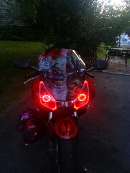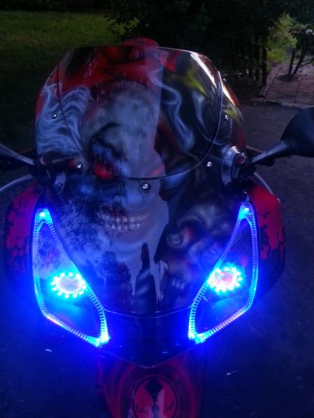 well my headlight is getting shipped out tomorrow. sooo by Wednesday I should have everything back in good to go. I just got done hooking all the wiring up to make sure it works. next is get the new lens put on and everything back on the bike. Clean up the wiring and were all done! so far a small review on functionality. The remote- it works amazing, very responsive and works from a good distance. the demon eyes- I hooked them up and had them on but it didn't do it much justice in the light.Color changing rings- are very bright! couldn't ask for better. Hid projector- I turned them on just to see one if they work and two if they are as bright as they say. and wow... I glanced at these things and had to walk away for a few minutes. I think its going to make night riding amazing.