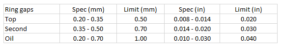 I've been searching for a while now (ONLINE, FORUMS, *THIS FORUM* AND IN SERVICE MANUAL), and for the life of me, I cannot find the specification for the piston ring end gaps. I'd like to think that I missed the spec in the service manual. However I've looked and even had another tech look and I cannot find it. online (Google) searches reveal nothing and I'm surprised I haven't found any discussion on this forum regarding this subject, as any of us mechanically inclined savvy mechanics know this is a very important specification when gauging/checking engine wear and sizing new rings properly.