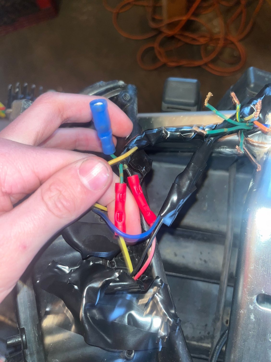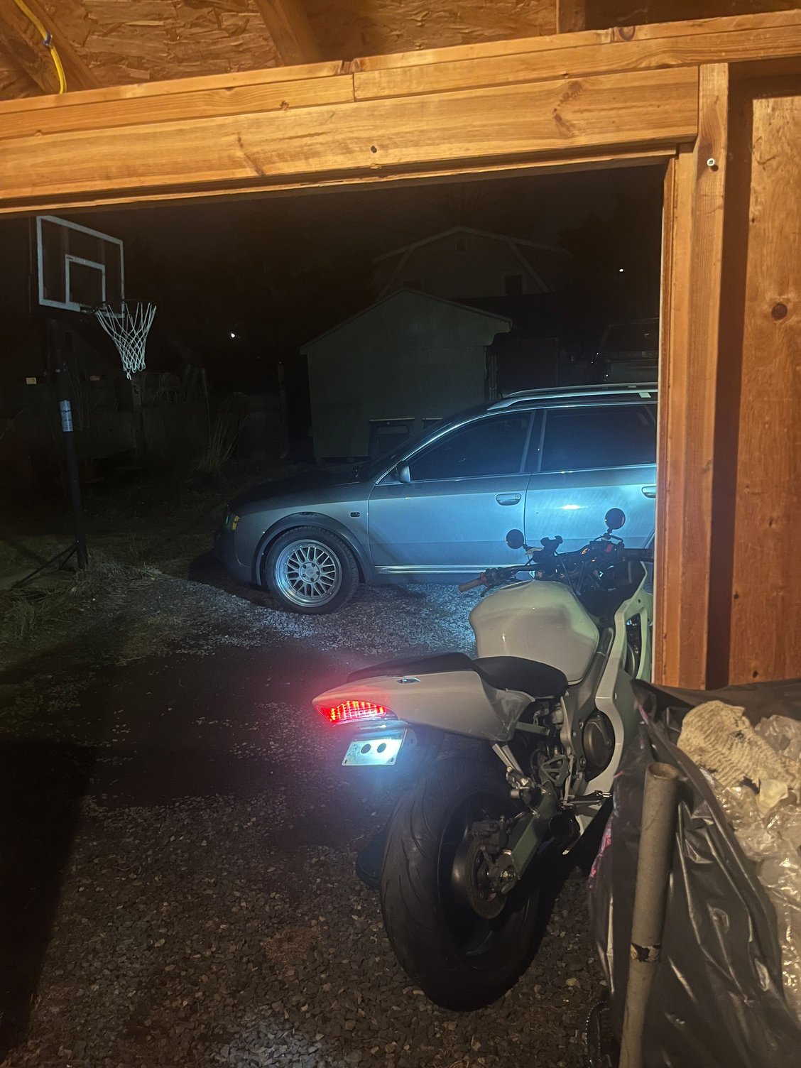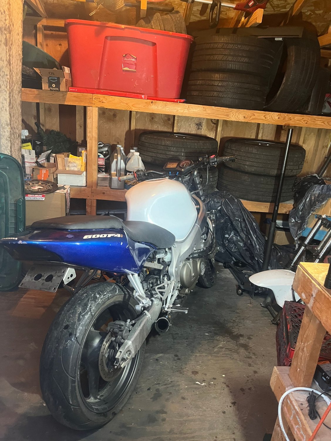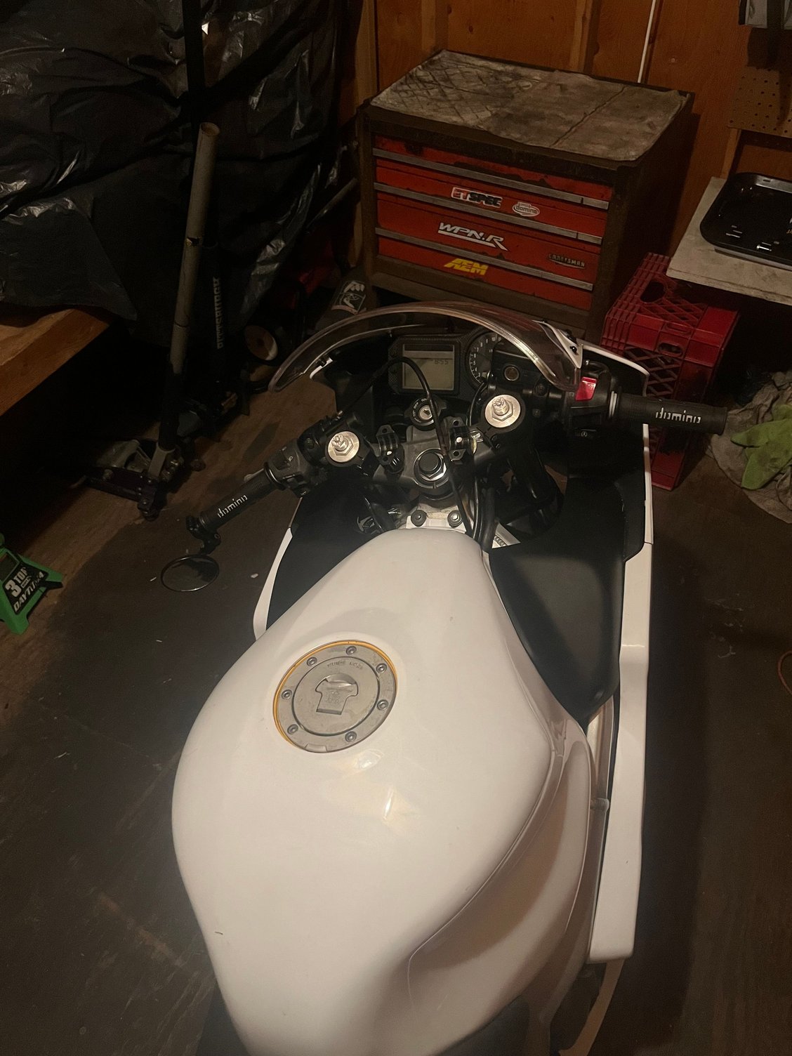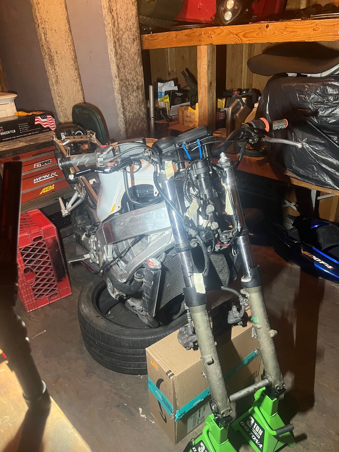 hey all within the last month I picked up a 2006 f4i. the bike has 44,000 and it runs great. i recently have been doing a bunch of work to make the bike how i want it. the bike was naked when I purchased with bad tires. it has clean air mod, oil pickup and baffle, some fat bars. the owner gave me a full extra triple tree with forks and another full front brake system with calipers and master. spare front rim and rotors, 2 seat fairing and 2 front wheel fairing. I have done a lot of work in the little time I have but the bike is coming together great. integrated tail wiring was a mess new tires spare forks getting rebuilt and put in soon lower and upper speedo and fairing stay brackets, it was zip tied before. sat like this while i waited for wheels, had to get clever to get the wheels back on without the proper jacks or straps from ceiling how the front wheel was installed waiting for fairing bolts, doing coolant flush soon