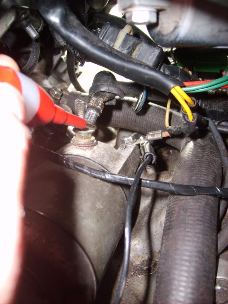 That relay (solinoid) has 2 smaller wires going to it, a Green/Red and a Yellow/Red. You need to see if you're getting power to the Yellow/Red wire when you actually press the Start switch. I suspect that you're not, but you need to test to be sure. Leave your testor attached to the - terminal of the battery, and the probe end try to attach it to the Yellow/Red wire. The probe should light up when you hit the starter button.