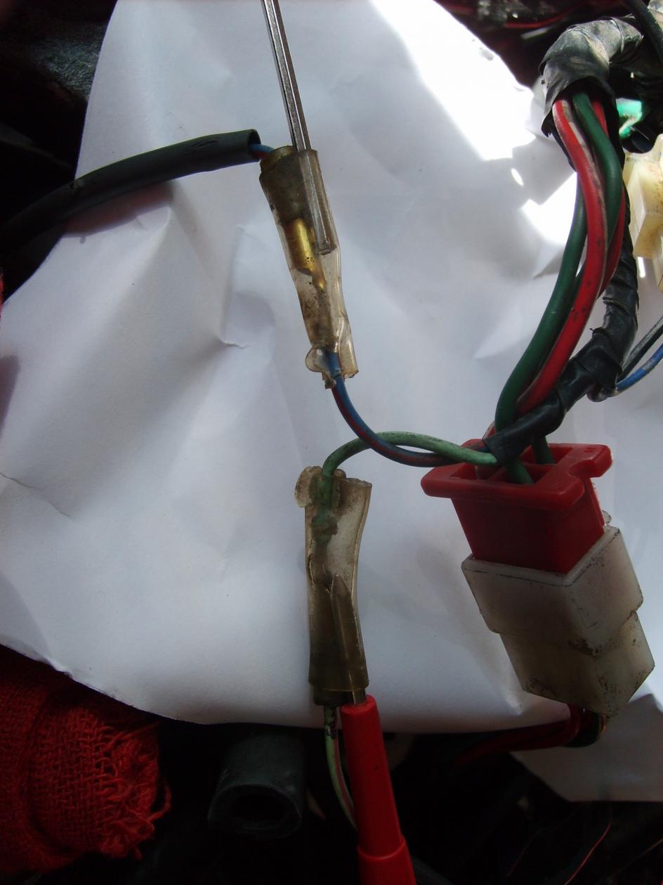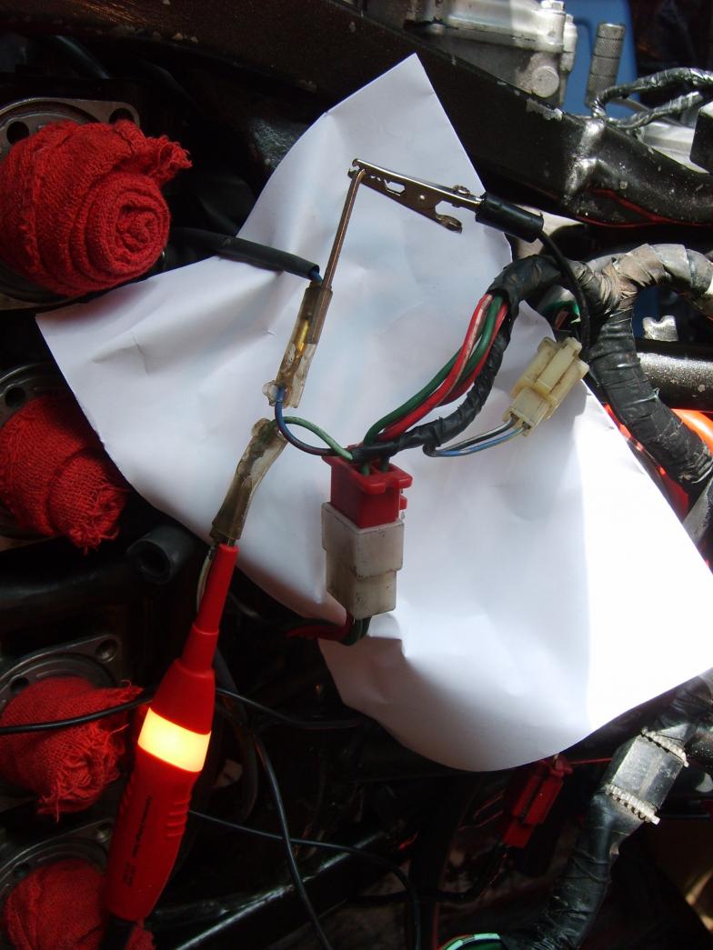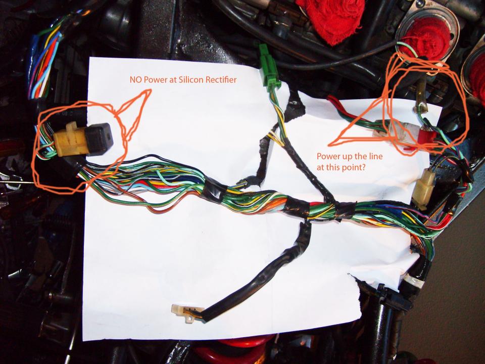 I think I found the Silicon Rectifier? Its in the photos and the wire colors fit other that it also has two light green wires going to is as well. I'm guessing that they are ground wires? Either way there is no power at that point,(the silicon rectifier) you were right! So I took apart the wiring harness. I followed the Red/Green Wire up the harness from the Silicon Rectifier to a second point of connection (also in the photos as "power up the line"), I tested there and had power when I pushed the start button but not at the silicon rectifier when I pushed the start button? So I followed the other wire coming off the silicon rectifier down the harness the other way and its ends at a green plug and its not connected to anything? I don't understand how there is power up the line on the same wire but not down the line on the same wire? Got any ideas.. and When I took apart the harness there were multiple points where the wires were crimped together and taped. I don't know if that's how its should be or not and weather that would effect anything. The colors of the crimped wires are the same and have a good connection but I thought I would ask. I put in photos. There is a photo of the plug I'm talking about..I don't know what It goes to? It has six (6) wires on it and they are...